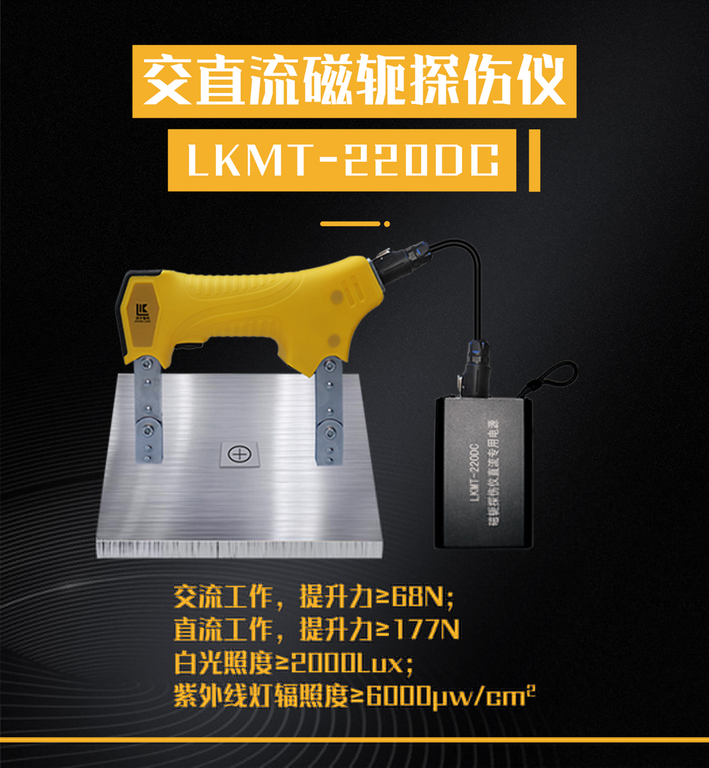 1、LKMT-220DC交直流磁軛探傷儀由D型探頭、電源適配器、鋰電池電源組成;產(chǎn)生交流或直流磁場進行探傷。