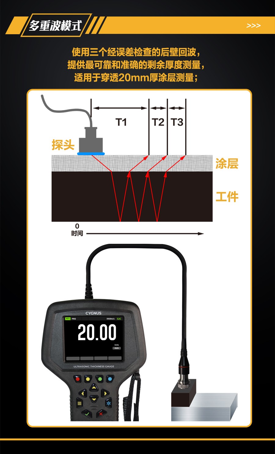 (3)多重波模式使用三個經(jīng)誤差檢查的后壁回波,提供最可靠和準(zhǔn)確的剩余厚度測量,無需去除涂層(厚度達20mm);(單晶探頭)
