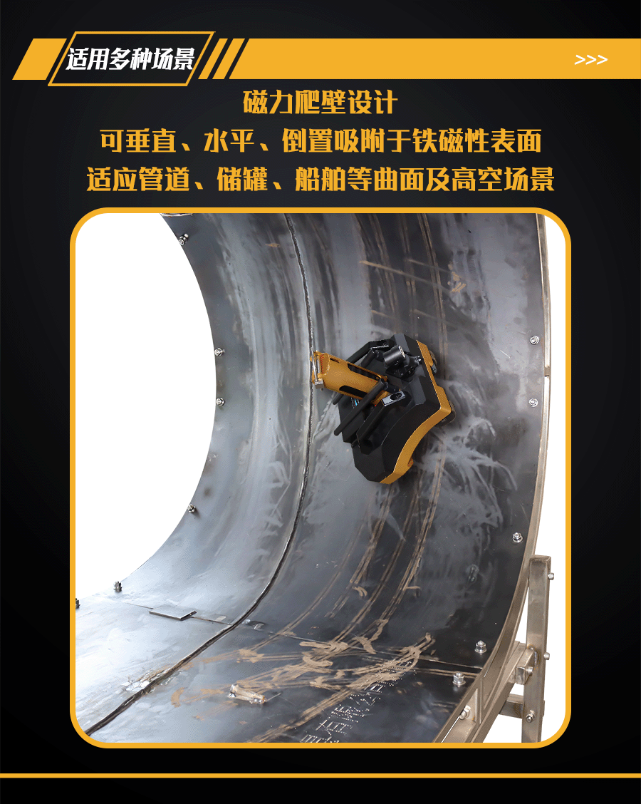 1、磁力爬壁設(shè)計,可垂直、水平、倒置吸附于鐵磁性表面,適應(yīng)管道、儲罐、船舶等曲面及高空場景。