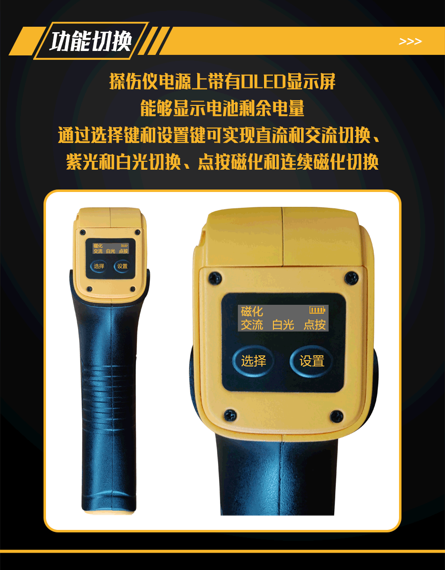 4、鋰電池電源帶有OLED顯示屏及操作按鍵;可顯示及設(shè)置剩余電量和電壓、直流或交流探傷模式、點按磁化或連續(xù)磁化工作模式、紫外線或白光照明模式。
