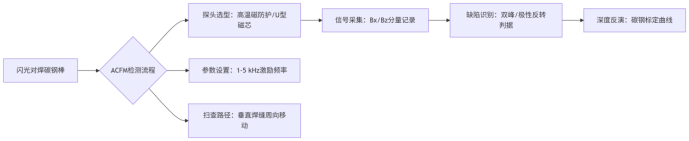 ACFM對(duì)鐵磁性材料(如碳鋼)敏感,檢測(cè)深度約3 mm(不銹鋼5 mm,鋁材10 mm),覆蓋閃光對(duì)焊常見(jiàn)表面裂紋、未熔合等近表面缺陷。