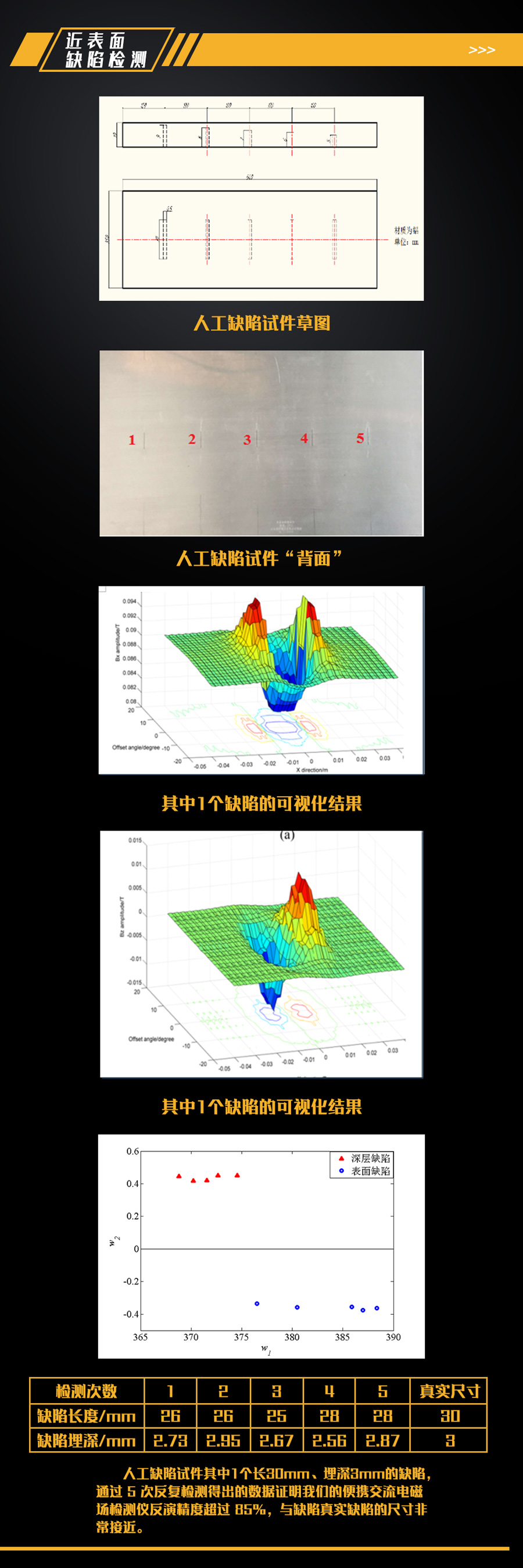 當(dāng)工件完好時各磁場分量為零,若有裂 縫存在,工件表面磁場便會產(chǎn)生變異,儀器探頭迅 即將檢出的訊號輸入計算機(jī)分析,經(jīng)軟件運(yùn)算后可實(shí)時地將裂縫之正確位置長度及深度顯示出來。