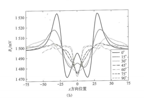 如圖5-8所示,當(dāng)檢測試件為鋼材料時,掃查方向與裂縫方向的夾角從0°增加到90°時,Bx信號最大值的整體趨勢為逐漸增大。然而,當(dāng)檢測試件為鋁材料時,Bx隨著夾角的增大,所有的信號都是減小的