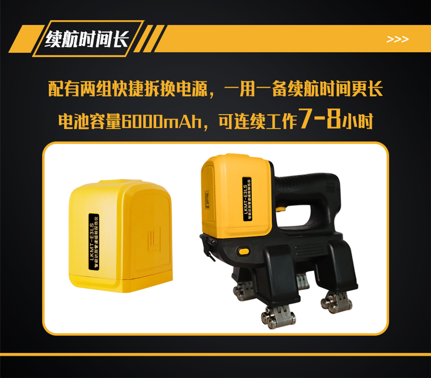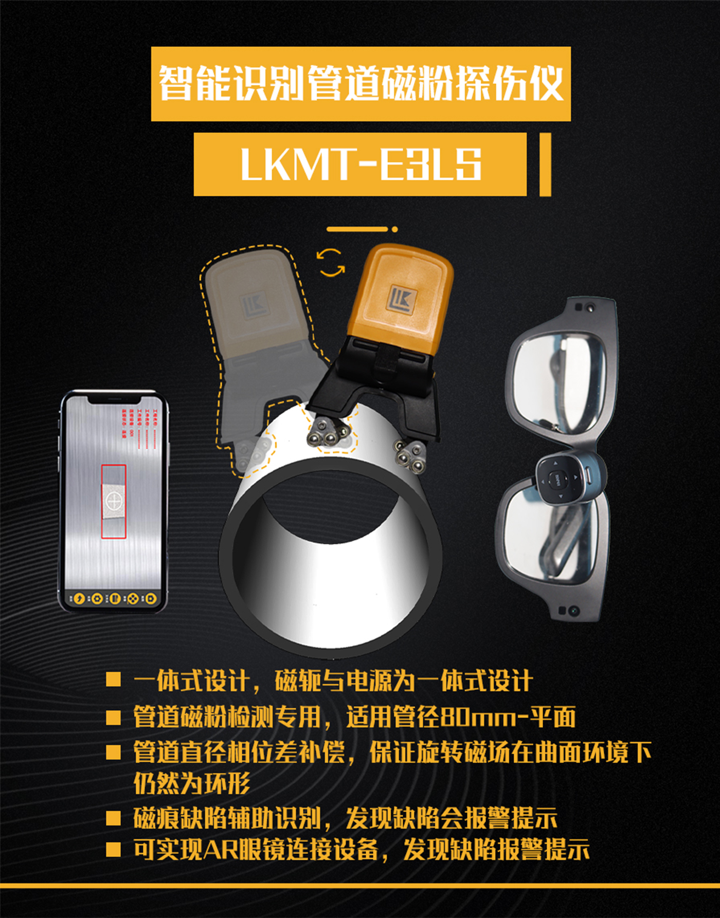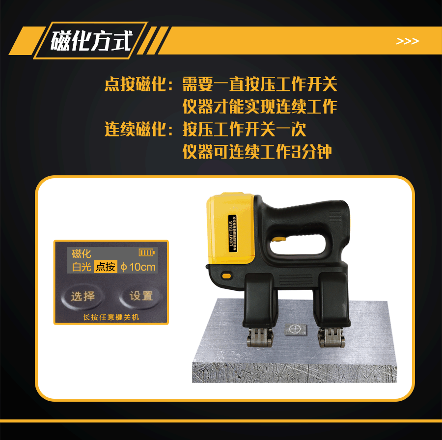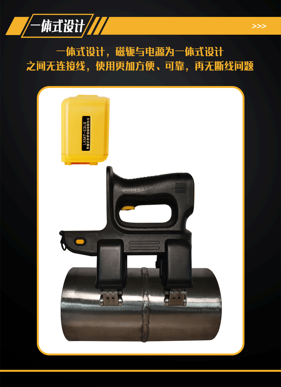 1、LKMT-E3LS一體式旋轉(zhuǎn)磁場管道磁粉探傷儀,探頭與鋰電池一體式設(shè)計,無需使用線鏈接;