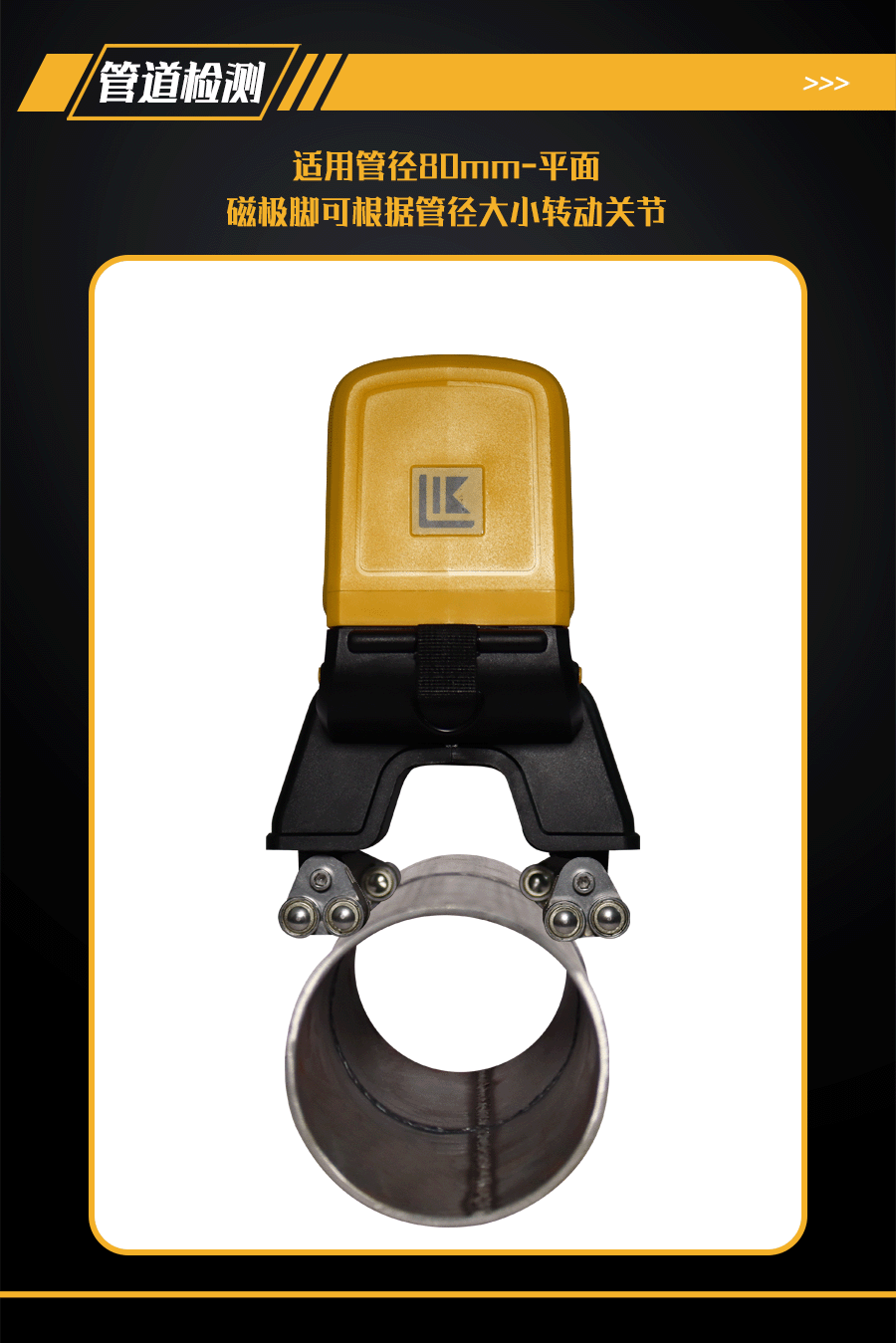 9、可檢測≥80mm直徑管道焊縫及平板焊縫;磁極腳為可轉(zhuǎn)動關(guān)節(jié),可隨不同管徑的工件調(diào)節(jié)磁極角度,使磁極貼合管件弧面,保證探傷效果;配有管道焊縫、平板焊縫檢測2種規(guī)格磁極腳;