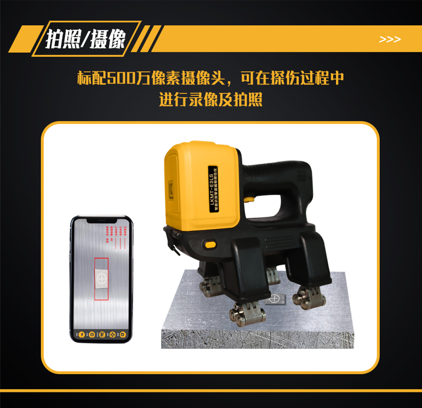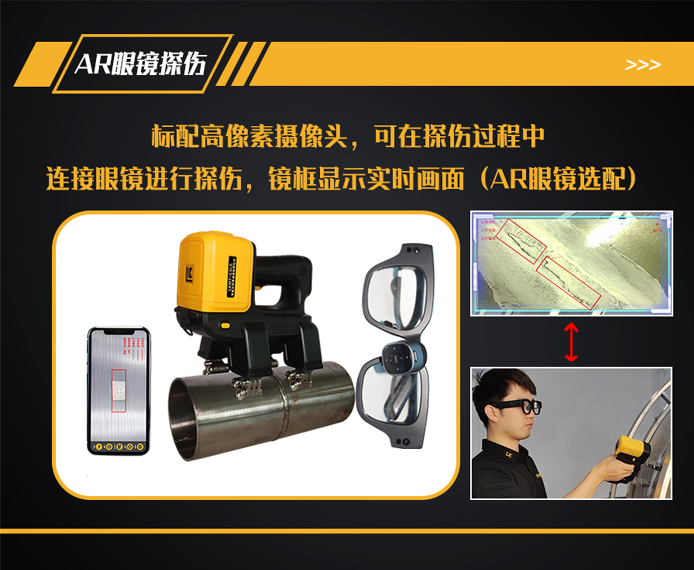 11、探頭內(nèi)部裝有500萬像素攝像頭,手機、平板電腦或AR眼鏡等手持終端安裝APP軟件,通過Wi-Fi與探頭鏈接,手持終端實時顯示探傷狀態(tài);