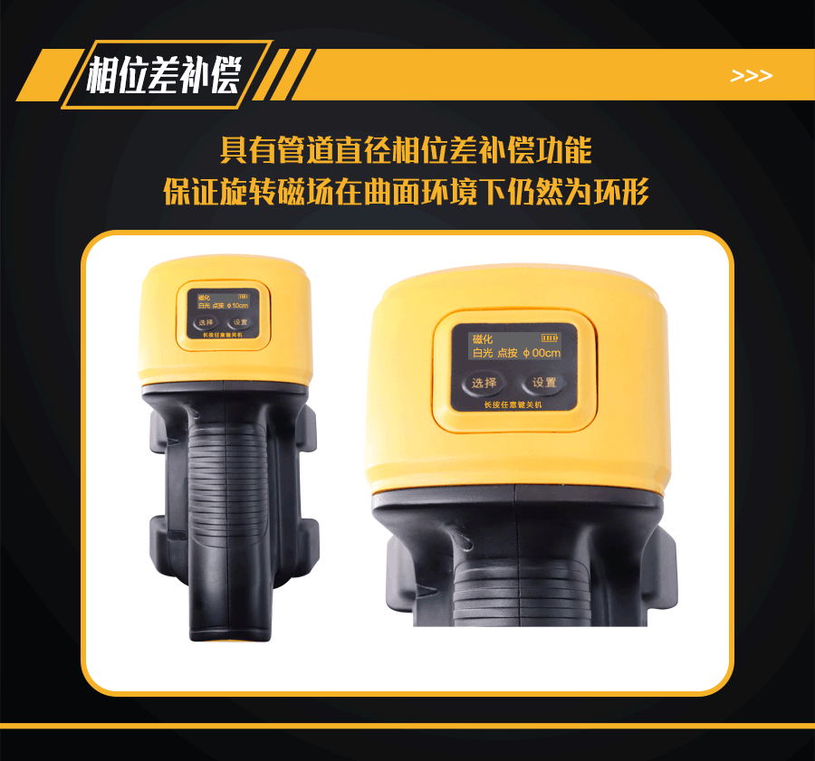 10、管道直徑相位差補償功能;檢測不同直徑管道,可在鋰電池電源OLED顯示屏上進行直徑選擇,設(shè)置對應(yīng)管道直徑的相位差補償,保證旋轉(zhuǎn)磁場在曲面環(huán)境下仍然為環(huán)形;