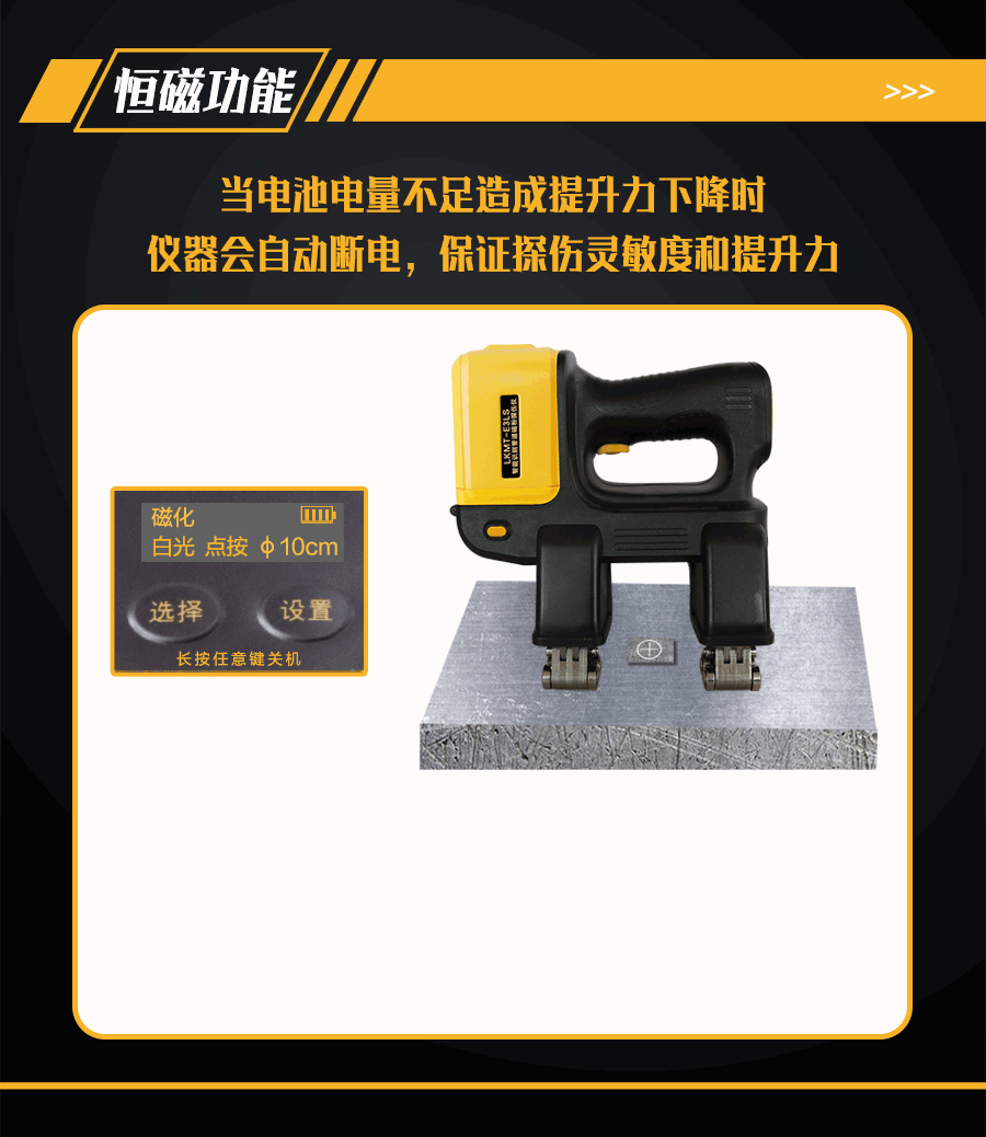 6、恒磁控制功能,因電量下降導(dǎo)致提升力不滿足探傷需求時自動斷電,保證探傷靈敏度;